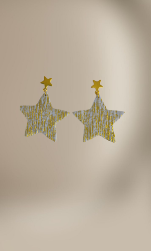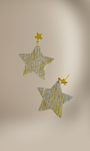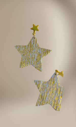 Acești cercei sub forma de steluță, cu o textură aurie îmbogățită cu folie decorativă, adaugă o notă de eleganță și originalitate oricărei ținute.
