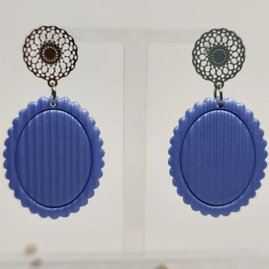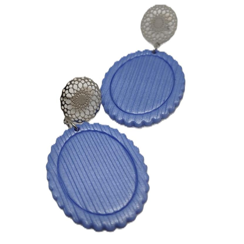 Cercei lucrati manual din lut polimeric accesorizati cu elemente fine din otel inoxidabil .