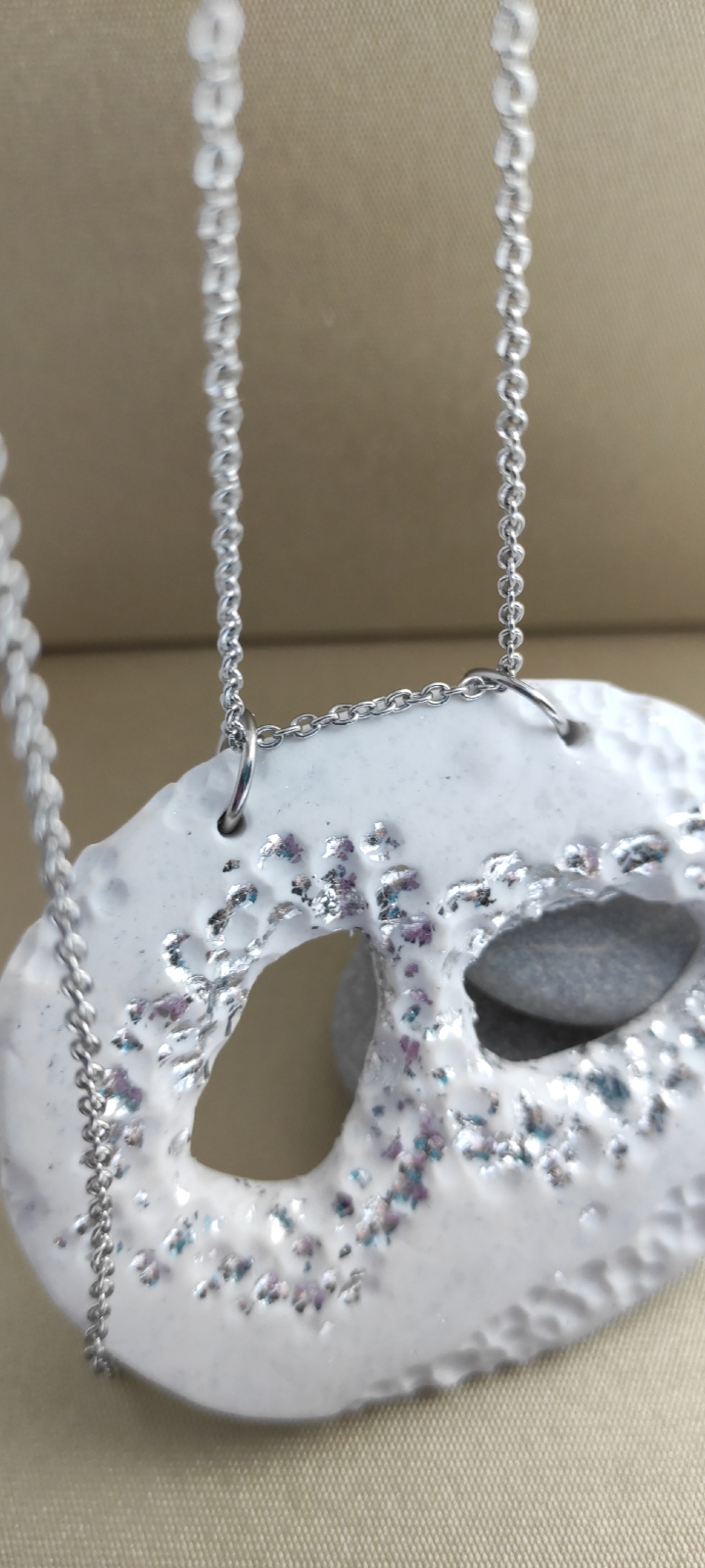 Dimensiunea sa generoasă, de 6/7 cm, îl face să iasă în evidență, iar culoarea albă oferă un contrast elegant cu foita argintie care reflectă lumina într-un mod subtil și sofisticat.